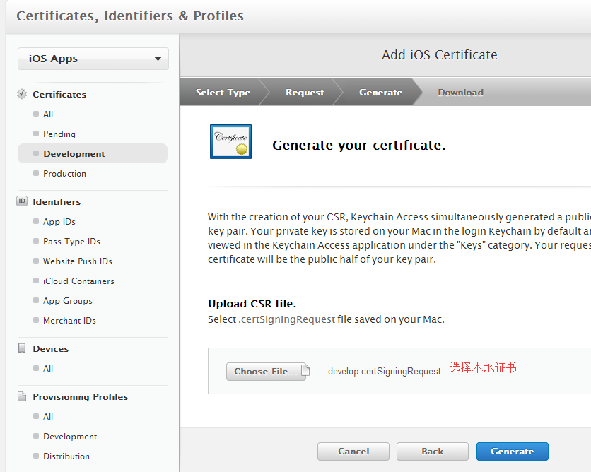 苹果开发者账号中,创建证书(Development和Production)——上传CSR文件——下载证书运行 ( xxx.cer文件)