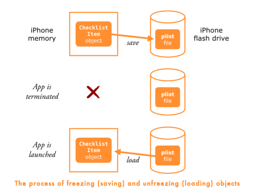 }- NSKeyedArchiver, which is a form of NSCoder that creates plist files, encodes the array and all the ChecklistItems in it into some sort of binary data format that can be written to a file.