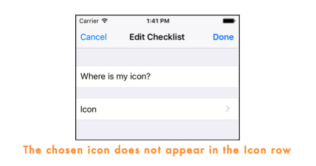 let checklist = Checklist(name: textField.text!, iconName: iconName)Make this change. In ListDetailViewController.swift’s done() method, replace the code that creates the new Checklist object with the above.