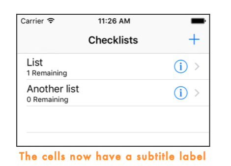 }You call the countUncheckedItems() method on the Checklist object and put the count into a new string that you place into the detailTextLabel. Notice that you can even call methods inside interpolated strings. Sweet!
