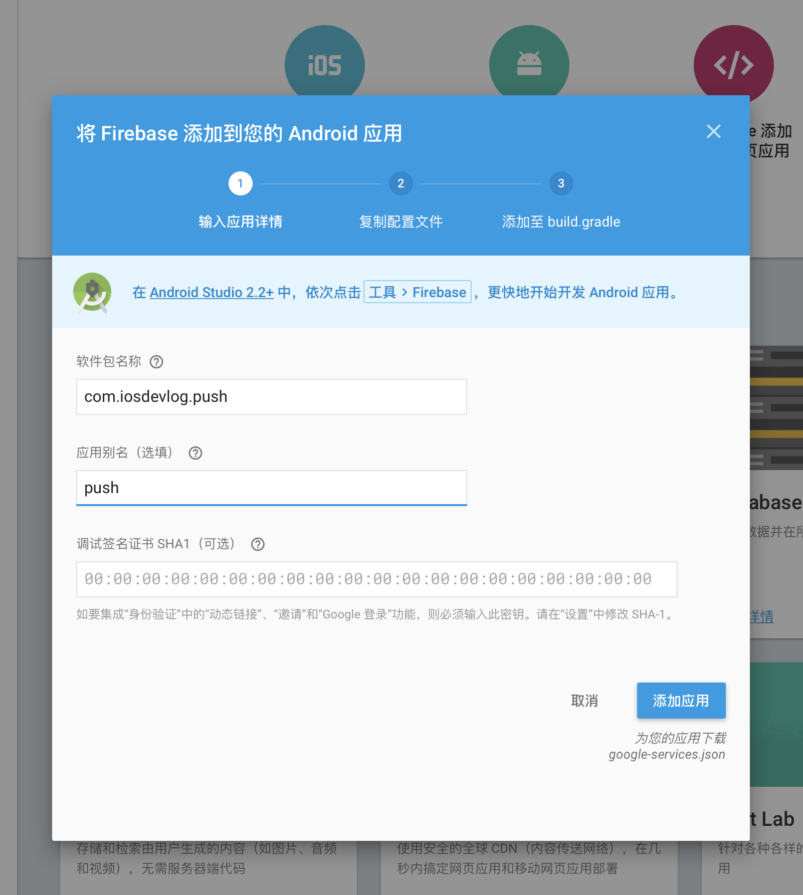 - 出现提示时,输入您的应用的包名称。输入您应用使用的包名称十分重要。只有当您将一个应用添加至您的 Firebase 项目时才能进行此设置。